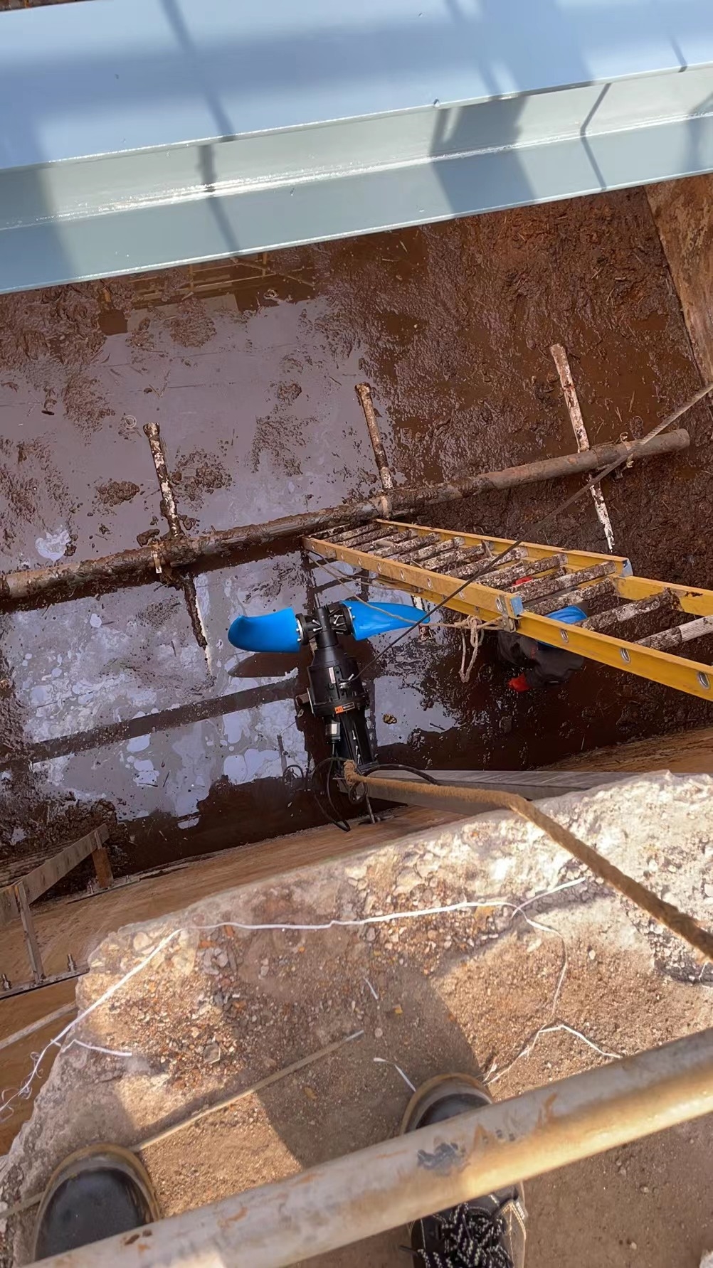 (5)当吊装低速推流器时,如潜水推流器沿导杆上升过程中可能会出现卡阻现象时,应用手晃动起吊环链,不得强行起吊,以免损坏起吊装置;同样如推流器沿导杆下滑过程中出现卡阻现象时(起吊环链会出线松动现象),用手晃动起吊环链,让其下滑。
