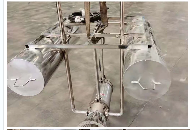 5、潜水式推流曝气机采用优质的SUS304 不锈钢制造,充分耐各种腐蚀性水体。推流曝气机由专用电动机、叶轮、浮筒、浮筒底座、吸气室、吸气管、专用保护开关等组成。产品结构紧凑、高性能、低损耗、重量轻、安装简单、操作方便,射流喷气角度可跟据需要来调整,可向上下自由调节60 度(适合各种池底),工作区域的水体深度不得浅于0.50 米(自然底)。