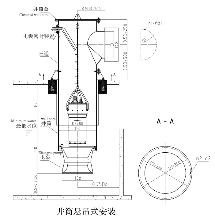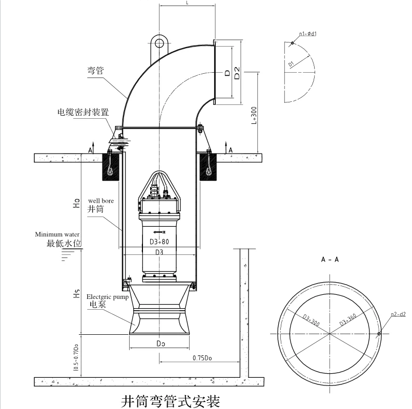 较大的潜水泵(一般叶轮直径在1米以上),采用带封闭进水流道的安装形式。