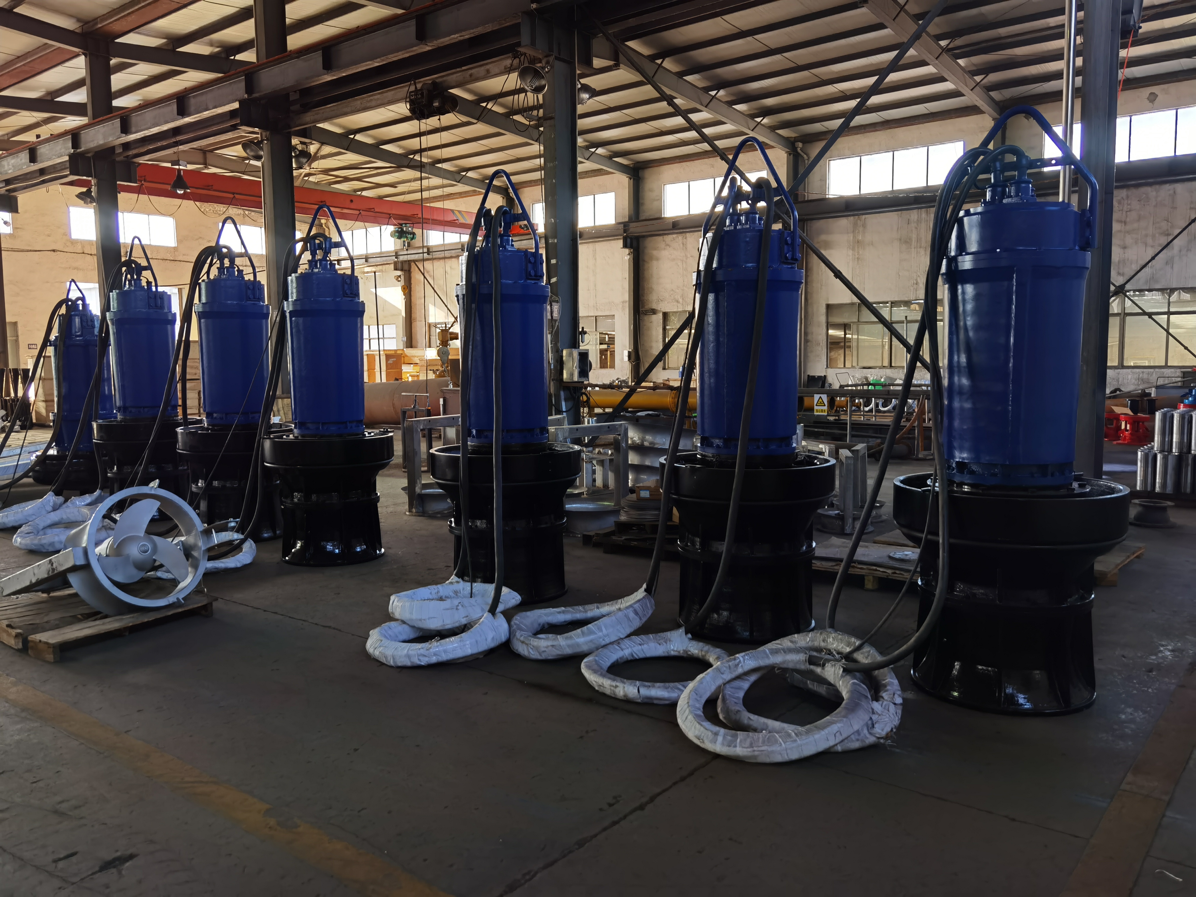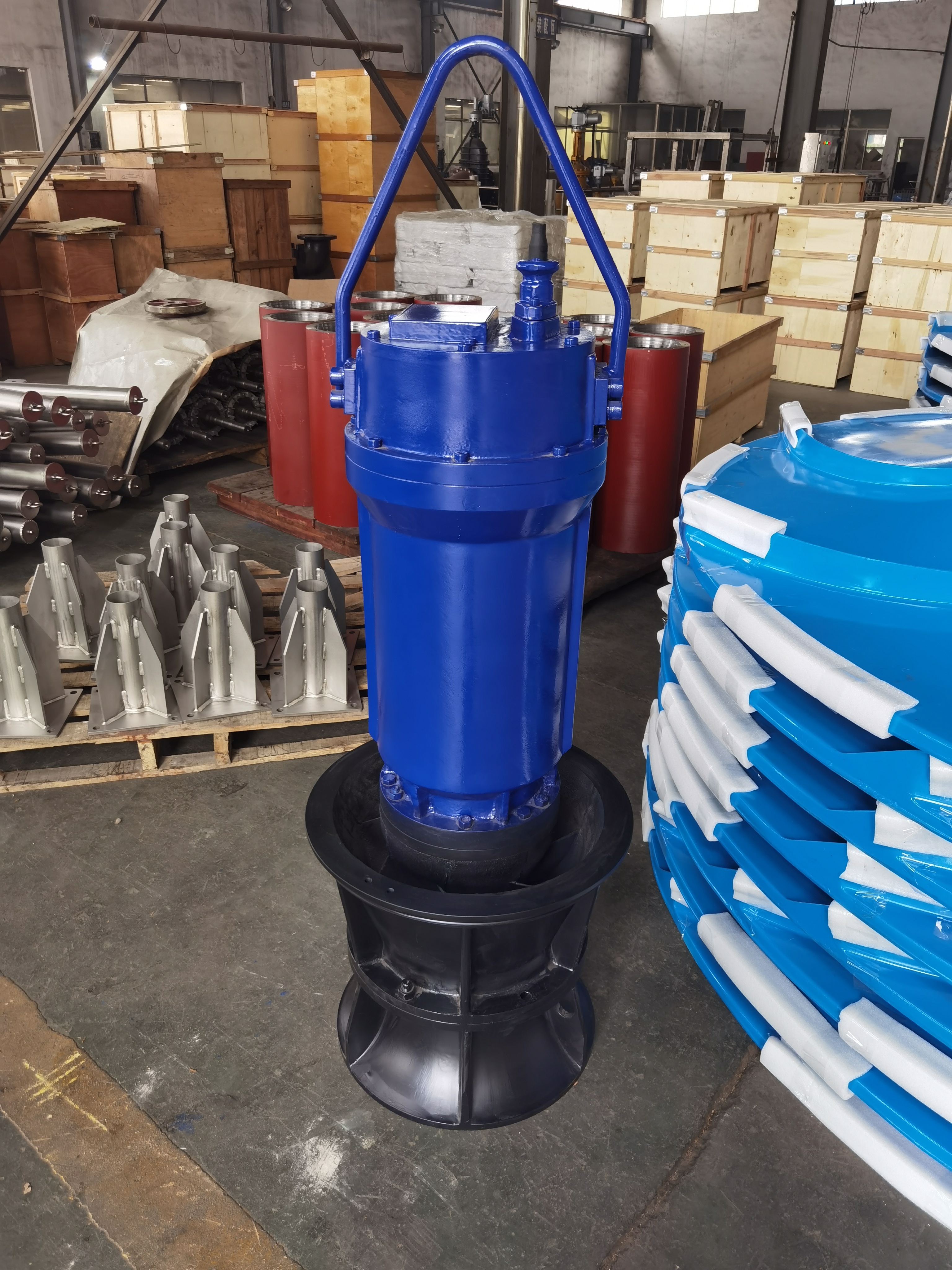(1)潜水雨水泵由潜水电机与水泵构成机电一体立式结构,泵与电机同轴结构紧凑使用方便,水泵叶轮的叶片半可调节,均布在叶轮轮毂上。