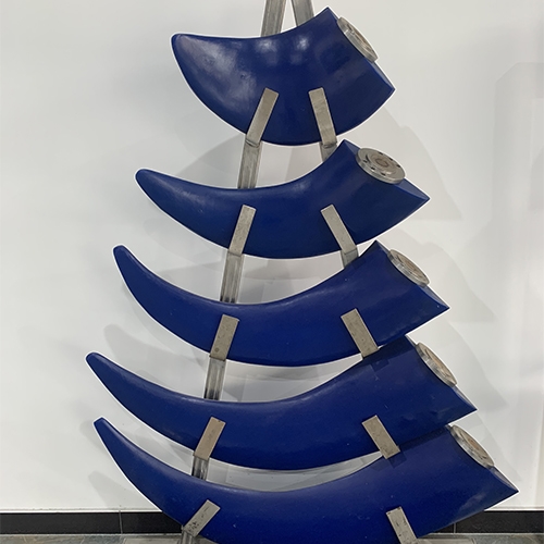 低速推流器叶片为双香蕉形,用玻璃纤维强化聚胺酯浇铸,有效防止了叶片的断裂问题;叶片进口边向后弯曲,具有长期自动清洗性能;叶片用锁紧螺母紧固在轴上,维修时,容易拆卸更换。
