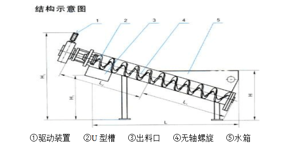 砂水分离器在驱动装置的驱动下,砂水混合液从螺旋砂水分离机顶部进入水箱,混合液中比重较大的砂粒、杂物等沉降于U 型槽底部,在螺旋片的推动下,砂粒沿斜置的U 型槽底向上提升,离开液面后继续推移一段距离,在砂粒充分脱水后经排砂口卸至集砂箱,与沉砂分离后的水从溢流口排出。螺旋砂水分离机主要由无轴螺旋叶片,U 型槽,水箱,导流装置及驱动装置等部件组成,该设备主要适用于对污水处理厂沉淀池排砂出的砂水混合液进行砂水分离。